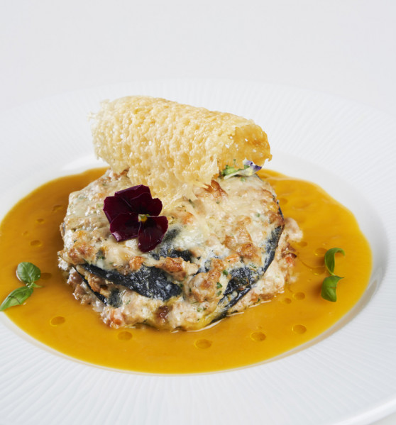 Preparar la pasta fresca a mano o con la batidora. Para ello, mezclar el carbón con la harina, añadir los huevos y empezar a amasar. Dejar que repose en una bolsa sellada en el frigorífico durante al menos un par de horas. En un recipiente, mezclar la bechamel con la salsa Èragùbianco, el tomillo y el perejil frescos y salpimentar. Para preparar las virutas de Parmigiano Reggiano, poner una cuchara de queso rallado en un trozo de papel de horno, calentar en el microondas durante un minuto hasta que se funda y dejar que se enfríe. Extender la masa y formar círculos de unos 8 cm de diámetro. Cocer en agua con sal hirviendo durante un minuto, escurrir y enfriar en agua helada. Formar porciones de lasaña alternando un círculo de pasta con salsa Èragùbianco (previamente preparada) y una pizca de queso Parmigiano Reggiano rallado hasta que tenga 5 o 6 capas. Preparar 4 porciones. Hornear la lasaña en un horno precalentado a 180 °C durante 20-30 minutos hasta que se hayan dorado. Mientras la lasaña está en el horno, preparar la velouté de tomates amarillos. Sofreír el ajo en una sartén con un chorrito de aceite de oliva virgen extra, añadir los tomates dátil amarillos enteros y cocinarlos durante 15 minutos. Mezclar y salpimentar. Poner la velouté de tomate en un plato, colocar cuidadosamente la lasaña encima y servir con virutas de parmesano, brotes de albahaca y un chorrito de aceite de oliva virgen extra.