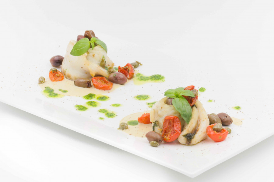 Sfilettare e deliscare i branzini. Con l'aiuto di un coltello rifilare i filetti ottenuti e tagliarli a metà per il lungo, avendo cura di lasciarne unita un'estremità. Su di una placca rivestita di carta forno sistemare i filetti di pesce a forma di nidi, quindi condirli con un filo d'olio extravergine, pepe e sale. Infornare a 180° per dieci minuti. Scaldare l'hummus sul fuoco e diluirlo con del brodo vegetale o di pesce. Stendere la salsa su ciascun piatto. Accomodarvi i nidi di branzino e decorare con le olive, i pomodorini Dorati e i capperini scaldati in padella. Ultimare il piatto con dell’olio aromatizzato al basilico e una macinata di pepe.