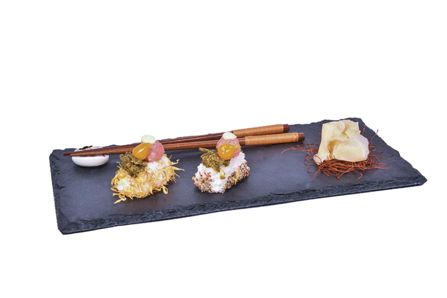 Ricoprire un nigiri con Petali di calendula e l’altro nigiri con Pepe colorato macinato grosso. Guarnire con un ciuffetto di Maionese della casa ed un Peperoncino a goccia giallo dolce,