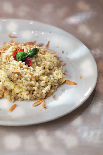 In abbondante acqua fredda lasciare l’orzo a bagno per dodici ore. Avendo cura di conservare l’acqua utilizzata, scolare l’orzo. Nel frattempo in una casseruola antiaderente, scaldare un poco d’olio extravergine e farvi appassire lo spicchio d’aglio che andrà poi eliminato. Incorporare l’orzo e lasciarlo cuocere aggiungendo via via l’acqua tenuta da parte e insaporendo con la polvere di Gran Cuoco granulare. Mescolare di tanto in tanto e, a cottura ormai ultimata, amalgamare la salsa alle mandorle e il pesto alla genovese. Aggiustare di sale e pepe e lasciare sul fornello ancora qualche istante. A questo punto tagliare le mandorle a filetti e farle tostare in padella insieme a un poco d’olio. Togliere l’orzotto dal fuoco e distribuirlo nei singoli piatti; decorare con uno spicchio di pomodoro, con i filetti di mandorle e con qualche foglia di basilico.