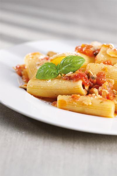 In abbondante acqua salata cuocere al dente i paccheri. Nel frattempo in una casseruola rosolare due spicchi d'aglio insieme a un poco d'olio extravergine; dopo qualche minuto, togliere la casseruola dal fuoco ed eliminare l'aglio, quindi incorporare la salsa Crudaiola. Scolare i paccheri e saltarli per qualche minuto a fuoco vivace nel condimento preparato. Completare con pecorino grattugiato e qualche fogliolina di basilico fresco; servire subito.