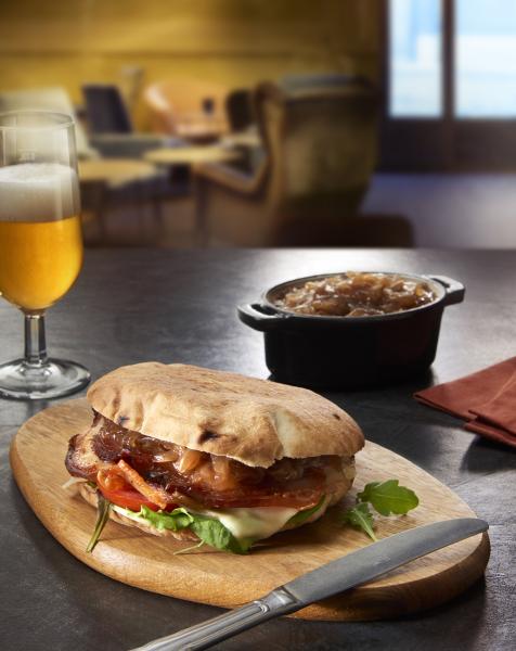 Calentar el pan salentino en un horno ventilado a 220° durante unos 3 minutos o bien en una sartén, tostadora o plancha. Rellenar el pan salentino con la mezcla de hierbas, la porchetta en lonchas ligeramente calentada, las rodajas de tomate y la cebolla caramelizada.