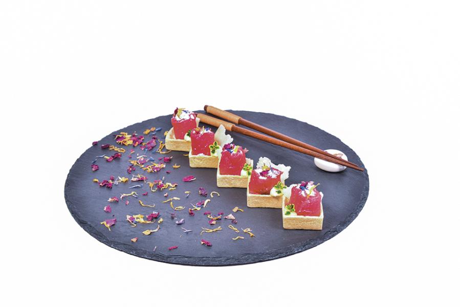 Mescolare la ricotta con una parte di Miscela di fiori per decorazione. Farcire la fettina di carne con il composto ottenuto ed arrotolarla. Tagliare il rotolo di carne in 5 pezzi e posizionare ogni pezzo all’interno di un Mini trendy. Decorare con la Miscela di fiori, un ciuffetto di Maionese della casa e timo limonato.