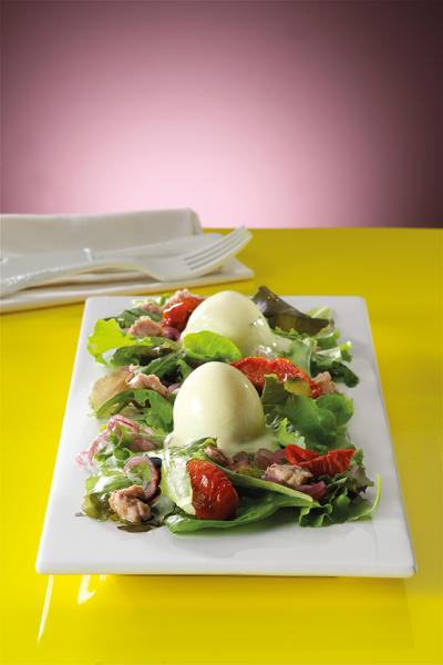 In abbondante acqua acidulata con aceto bianco, bollire le uova fino a rassodarle. Nel frattempo mondare e lavare con cura la misticanza. Tagliare a rondelle sottili le cipolle rosse e trasferirle in una ciotola; aggiungere la misticanza, il tonno e i pomodori Soleggiati. Condire con olio extravergine, la glassa all’aceto balsamico e sale; distribuire poi l’insalata nei piatti. In una terrina amalgamare la maionese con un poco di senape, lo yogurt e l’erba cipollina. A questo punto pelare le uova sode e accomodarle sull’insalata al centro di ogni piatto. Glassare poi con la salsa preparata e servire.