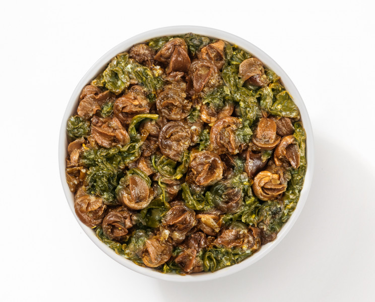 Escargots de l'espèce Helix, soigneusement sélectionnés à la main, décoquillés et assaisonnés à l'huile, bettes et plantes aromatiques. Excellents comme plat cuisiné en y ajoutant de la tomate.