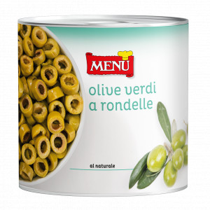 Olives vertes coupées en rondelles, préparées en saumure et prêtes à l'emploi. Excellentes pour garnir les pizzas et les focaccias, et comme condiment pour les salades. Excellentes pour les farces à base de viande.