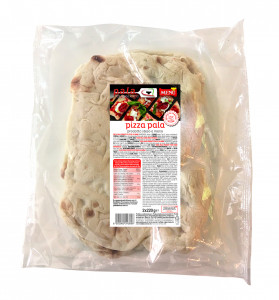 Pizza dont la forme rectangulaire particulière rappelle celle de la pelle à pizzas. Précuite et de la plus haute qualité, elle est prête à être garnie et mise au four. Produit artisanal à haute hydratation et long levage. Pâte légère, alvéolée et très croquante. Excellente base pour créer une authentique pizza gourmet ; parfaite aussi pour être coupée en tranches et partagée à table, accompagnée d'une boisson à l'apéritif.