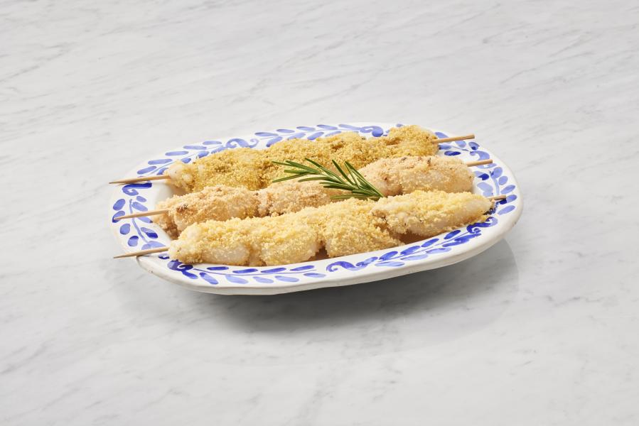 Enfiler les supions sur un pique à brochette et les passer dans la panure. Verser quelques gouttes d’Huile et faire cuire au four pendant 5 minutes à 180°C ou sur une plaque de cuisson 2 minutes de chaque côté. Ou bien, faire cuire dans une poêle antiadhésive avec un filet d’Huile d’olive extra vierge.