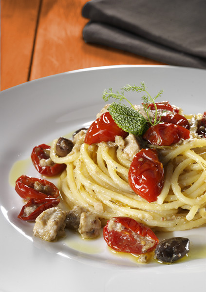 In abbondante acqua salata cuocere al dente i bucatini. Nel frattempo in una casseruola scaldare l’Olio extravergine di oliva insieme allo spicchio d’aglio che andrà poi eliminato, quindi incorporare il pesce spada, il Condimento al finocchietto selvatico e i pomodori Dorati. Lasciar insaporire sul fuoco per qualche minuto. A questo punto scolare i bucatini e farli saltare nel condimento preparato. Completare con qualche fogliolina di menta fresca e servire.