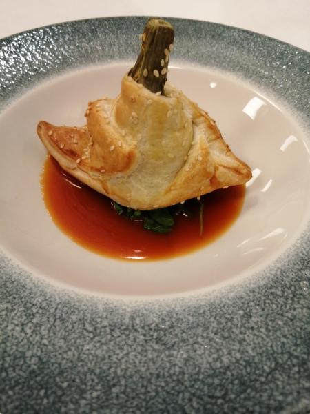 CARCIOFO RIPIENO DI GAMBERETTI E ZENZERO IN CROSTA SU BISQUE DI CROSTACEI