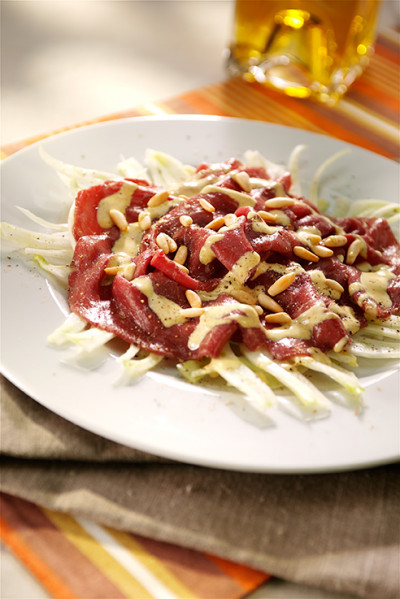 Con l'aiuto dell'affettatrice tagliare il finocchio a fettine sottili e poi a julienne, quindi immergerlo in acqua fredda. Nel frattempo in una ciotola versare il succo di limone e incorporarvi a filo l'Olio extravergine di oliva; aggiungere anche il Pesto di Senape, insaporire con pepe e sale e amalgamare con cura servendosi di una frusta. In una padella antiaderente far tostare i pinoli fino a quando risulteranno dorati. A questo punto scolare i finocchi e sistemarli sulla superficie di un piatto; accomodarvi sopra la Carne Salada precedentemente tagliata a fette sottili e distribuire i pinoli tostati. Condire con la salsa alla Senape e servire.