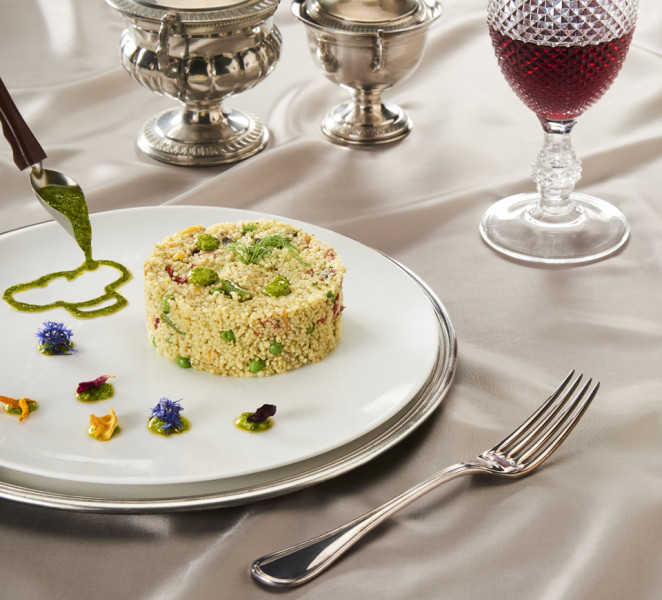 Aggiungere al Cous cous un goccio d’Olio extravergine di oliva e reidratarlo con 360 ml d’acqua bollente salata. Scottare i piselli e i fagiolini in abbondante acqua salata e raffreddarli in acqua fredda. Scolare i Dorati e il Mix Grill tagliando le verdure a cubetti e unire, mescolando, al Cous Cous reidratato aggiungendo il Pesto di Basilico Vegano e un goccio d’Olio extravergine di oliva. Riempire un coppapasta di Cous cous e sformarlo su un piatto.