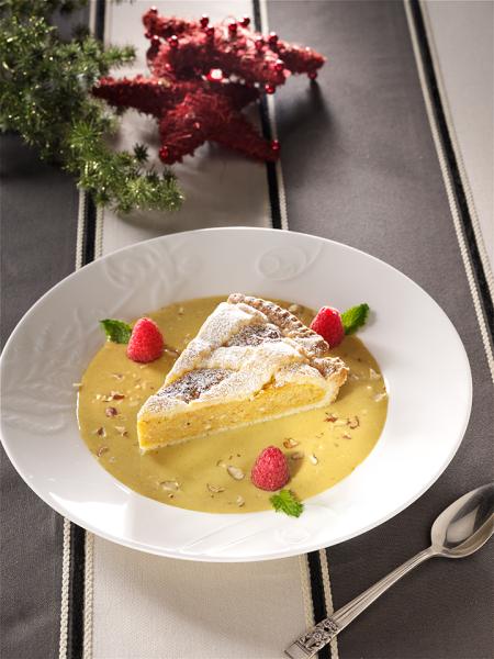 Preparare il ripieno mescolando tutti gli ingredienti tranne gli albumi delle uova che andranno aggiunti montati, in fase finale. Con l’aiuto del mattarello, stendere su una spianatoia la pasta frolla, tenendone da parte una piccola quantità. Foderare uno stampo con la pasta frolla e riempire con la farcIa preparata. Dalla pasta frolla tenuta da parte ricavare delle striscioline da incrociare sulla crostata a 1 o 2 cm di distanza l’una dall’altra, per formare il classico reticolo della crostata. Cuocere in forno a 160°C per circa 45 minuti. A cottura ultimata, lasciar raffreddare. Servire la crostata su un letto di Crema Inglese, preparata seguendo le istruzioni della confezione, aromatizzata con la Pasta di pistacchio. Decorare con lamponi, menta e nocciole tritate.