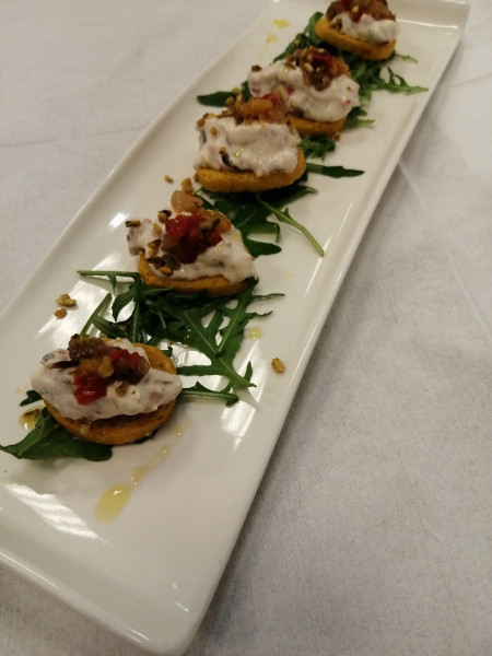 CROSTINI ALLA CURCUMA CON MIX GRILL, CAPRINO E GRANELLA DI PISTACCHIO