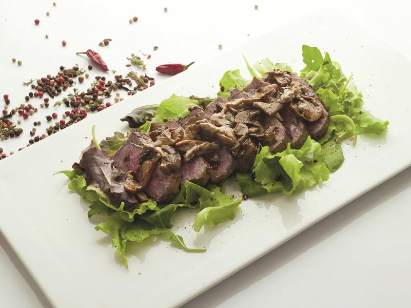 Sur le fond de l'assiette, disposer le mesclun, ajouter la viande puis les cèpes sautés.