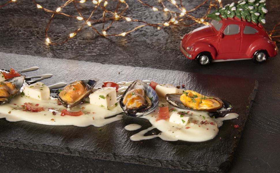 FANTASIA DI SEPPIE E COZZE SU VELLUTATA DI PATATE CON CACIO E PEPE