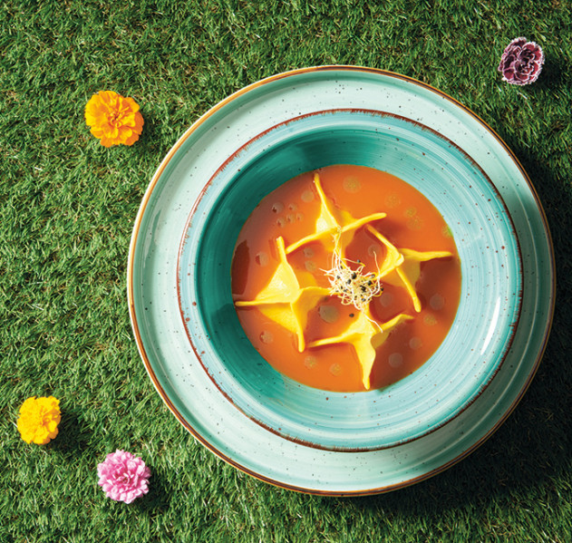 Preparare il ripieno dei fazzoletti: tritare finemente le Mazzancolle con un goccio di liquido di governo. In una ciotola mescolare la ricotta vaccina, le Mazzancolle tritate, il pane grattugiato, l’erba cipollina tritata, sale e pepe. Impastare tutti gli ingredienti creando un composto omogeneo. Stendere la pasta a mano o con la sfogliatrice e confezionare i fazzoletti con il ripieno ottenuto, dandogli una forma piramidale. Scaldare la Èbisquedicrostacei con un goccio di brodo delle Mazzancolle. Cuocere i ravioli in abbondante acqua bollente salata. Versare la Èbisquedicrostacei calda nel piatto da portata, quindi aggiungere i fazzoletti. Decorare con germogli di cavolo nero e gocce d’Olio extravergine di oliva.