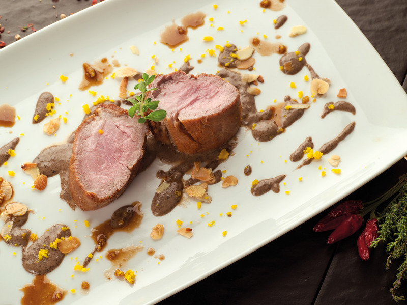 Tagliare il filetto di maiale in modo da ricavarne dei medaglioni che andranno poi passati nella farina. In una padella scaldare un poco d’Olio extravergine di oliva e farvi rosolare i filetti da entrambe le parti. Sfumare con il vino bianco, aggiustare di sale e continuare la cottura per qualche minuto. Nel frattempo in una casseruola scaldare la Crema di formaggi insieme alla Crema di funghi prataioli con tartufo, quindi distribuire la Salsa ottenuta su di un piatto da portata. Accomodare i filetti di carne sulla Salsa e completare con mandorle tostate e tuorlo d’uovo lessato.