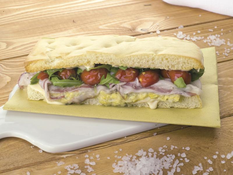 Tagliare la Focaccia orizzontalmente. Spalmare la Crema ai formaggi  su un lato e la Salsa di cuori di carciofo sull'altro. Farcire con pancetta affumicata e pomodori Dorati. Cuocere in forno a 200°C per 3-4 minuti.