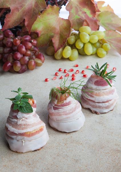 In una terrina preparare un impasto abbastanza consistente con il macinato di suino, la salsiccia, la Salsa di noci, la Crema di funghi prataioli al profumo di tartufo, i Fiokki e il Parmigiano Reggiano. Aggiustare di sapore con il Sale alle erbe. Riempire i fuselli precedentemente disossati, bardarli con le fette di pancetta e legarli con lo spago. Decorare con le erbe aromatiche.