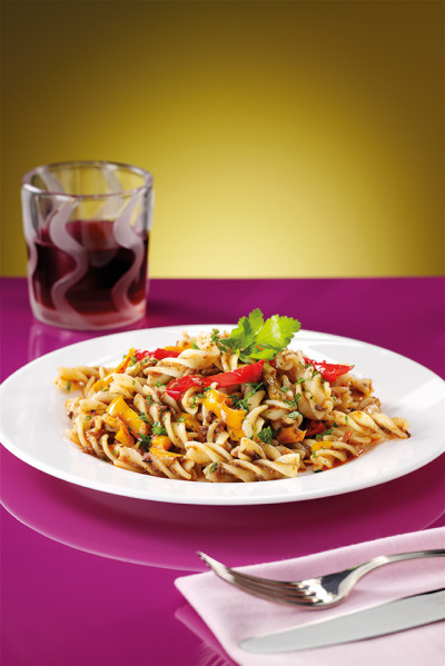 In abbondante acqua salata cuocere al dente i fusilli. Nel frattempo tagliare a listarelle i Peperoni semidry. In una casseruola scaldare un poco d’Olio extravergine di oliva e farvi sciogliere le Acciughe; aggiungere anche la Salsadoro e continuare a sobbollire regolando la consistenza del condimento con un poco d’acqua di cottura della pasta. A questo punto scolare i fusilli e farli saltare nel sugo preparato. Incorporare anche i Peperoni a listarelle e continuare a saltare mantenendo sul fuoco per qualche minuto. Ultimare con prezzemolo fresco e servire.