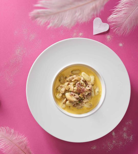 Impastare gli Gnocchi seguendo le indicazioni riportate sulla confezione. In un tegame d’acqua bollente salata, cuocere gli Gnocchi e saltarli nel sugo di Porcini e salsiccia. Scaldare la Crema ai formaggi e aggiungere il Preparato allo zafferano. Comporre il piatto con la crema allo zafferano ottenuta sul fondo e aggiungere gli Gnocchi conditi. Ultimare con Peperoncini in fili sottili e servire.