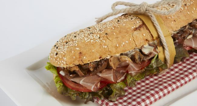 Panino ai 5 cereali con carne salada, melanzane e grancrema al parmigiano reggiano