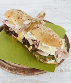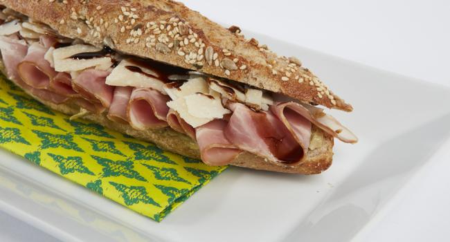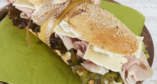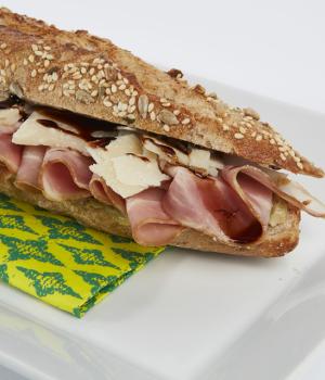 Panino au sésame, jambon cuit, Gransalsa de courgettes et brie