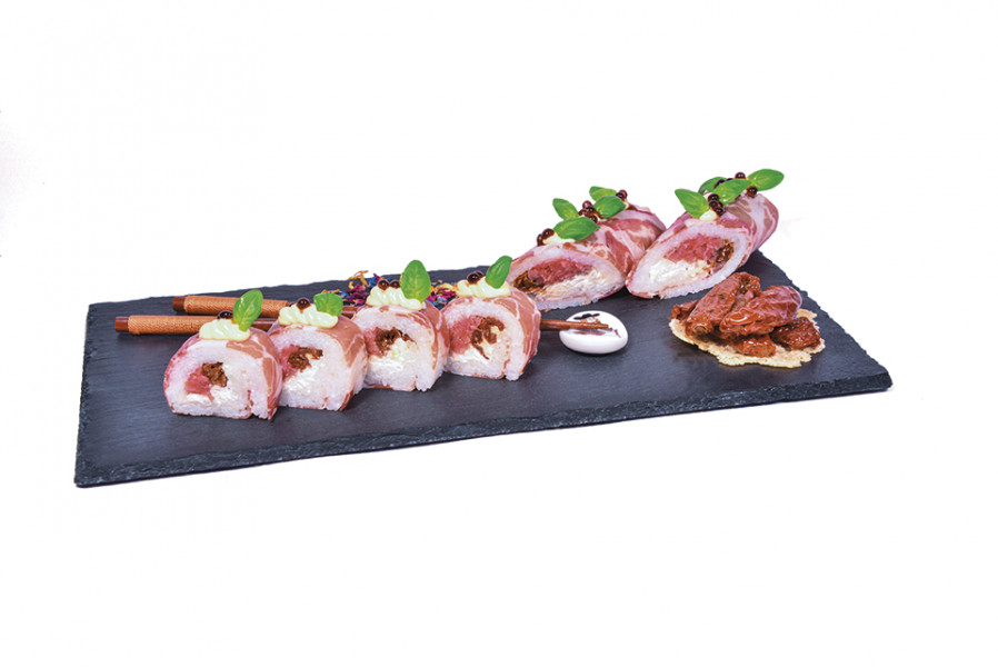 Utilizzare il capocollo di Martina Franca in sostituzione dell’alga Nori. Mescolare la metà dei pomodori Tuttosole con metà della Maionese della casa e la stracciatella. Farcire l’hosomaki con il composto ottenuto aggiungendo anche la battuta di carne. Arrotolare il roll e decorare con Maionese della Casa, pomodori Tuttosole a pezzetti, perline di Aceto balsamico e foglioline di basilico fresco.