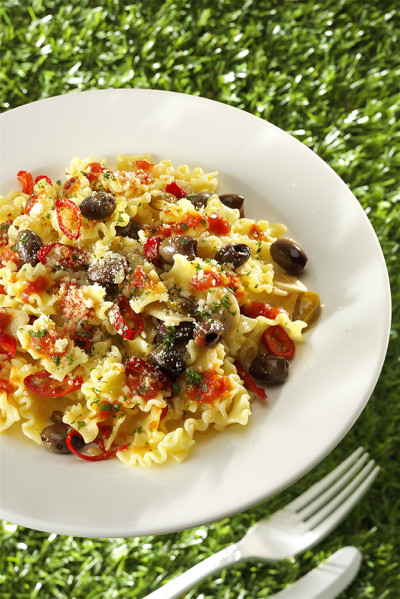 In abbondante acqua salata cuocere al dente le mafalde. Nel frattempo cubettare il pane pugliese, poi tostarlo in una padella antiaderente insieme a un filo d’olio extravergine e ai gambi di prezzemolo. Lasciar raffreddare, quindi eliminare i gambi di prezzemolo e macinare nel mixer i cubetti di pane tostato. A questo punto in una casseruola scaldare l’olio rimasto; aggiungere il condimento tricolore, il prezzemolo precedentemente tritato e un poco dell’acqua di cottura della pasta. Scolare le mafalde e farle saltare nel condimento preparato, incorporando anche le olive nostraline. Distribuire la pasta nei piatti e completare con un poco di Pomodorina riscaldata e una generosa spolverata di pane tostato macinato.