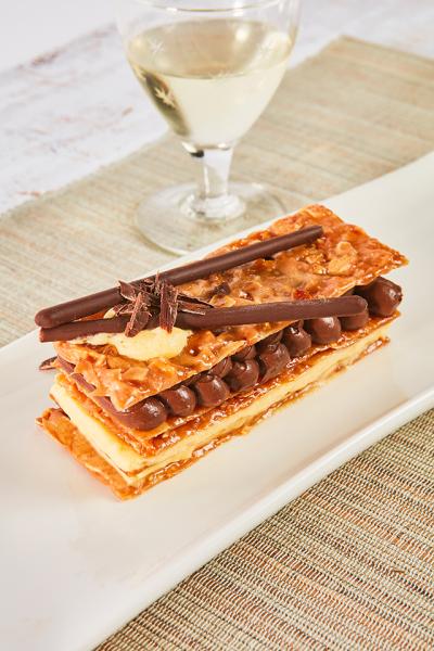 Préparer le croquant en l'étalant sur une feuille de papier sulfurisé, en formant des gaufrettes de 4x8 cm. Cuire au four statique pendant 7-8 minutes à 170°C. Sortir du four, laisser reposer pendant 2 minutes et retirer les gaufrettes. Préparer la crème pâtissière selon les instructions figurant sur l'emballage et la laisser reposer au réfrigérateur pendant au moins 1 heure. Travailler la ganache au batteur planétaire pendant 5 minutes en ajoutant la crème fraîche. À l'aide de deux poches à douille, composez le dessert : déposez une motte de crème sur l'assiette, puis ajoutez une gaufrette de croquant, la crème pâtissière, une gaufrette de croquant, la ganache au chocolat et terminez par une gaufrette de croquant. Décorer avec des crayons et des pépites de chocolat noir.