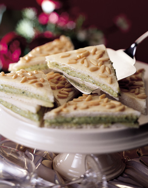 Mettere in una ciotola pari quantità di pesto e crema ai formaggi, quindi aggiungere altrettanto caprino. Spalmare una fetta di pane da tramezzini con la crema ottenuta poi coprire con un’altra fetta di pane. Stendere sulla seconda fetta di pane un leggero strato di crema ai formaggi , con l’aiuto di una spatola. Tagliare delicatamente tanti minitramezzini che andranno decorati con i pinoli. Disporre su un vassoio e servire.