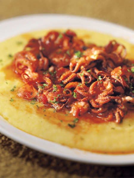 Con il Fumetto preparare il brodo di pesce .Scolare i moscardini dal loro liquido di conservazione. Nel frattempo soffriggere l’aglio e il prezzemolo tritati insieme a un poco d’olio extravergine; aggiungere i moscardini, il sugo all’arrabbiata, due cucchiai di Pomodorina e una macinata di pepe. Aggiungere il fumetto di pesce e lasciar cuocere a fuoco moderato per alcuni minuti. A questo punto preparare la polenta versando a pioggia il prodotto Menù in acqua bollente secondo le dosi riportate sulla confezione. Aggiustare di sale e lasciar sobbollire per cinque minuti, quindi trasferire la polenta in un piatto da portata e distribuirvi sopra il guazzetto di moscardini e servire.