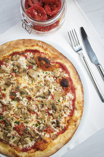 Étaler la sauce tomate assaisonné d'huile et de sel sur la base de la pizza rustique. Farcir avec la mozzarella et les champignons de couche préalablement égouttés. Cuire au four pendant trois à quatre minutes. Servir la pizza bien chaude avec un peu de persil.