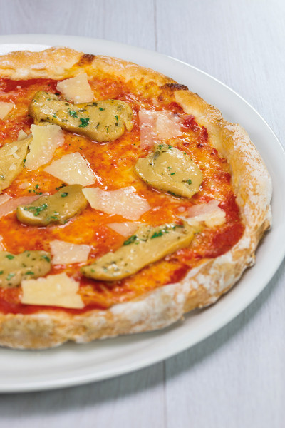 Stendere sulla Base pizza rustica la polpa condita con olio e sale. Farcire con la mozzarella e i Funghi porcini precedentemente sgocciolati dal loro liquido. Cuocere in forno per 3/4 minuti. In uscita ultimare con scaglie di parmigiano e prezzemolo tritato.