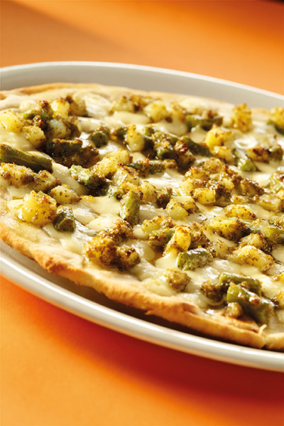 Scottare in acqua bollente le patate e i fagiolini. Condirli con il Granpesto alla genovese in asettico. Allargare il disco di pasta, aggiungere la mozzarella e poi le patate e i fagiolini precedentemente conditi e infornare.