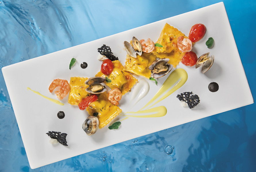 Preparare il ripieno dei ravioli: unire in una bowl Ècernia, la ricotta vaccina, il Parmigiano Reggiano, sale, pepe, pane grattugiato, la Patata pronta precedentemente sbollentata in acqua bollente e passata, infine impastare tutti gli ingredienti. Stendere la pasta a mano o con la sfogliatrice e confezionare i ravioli con il ripieno ottenuto. Rosolare uno spicchio d’aglio schiacciato in Olio extra vergine d’oliva, aggiungere le Vongole facendole aprire. Portare ad ebollizione e legare con il Roux bianco. Aggiungere il Sugo ai pomodorini datterini, Èmazzancolle e amalgamare gli ingredienti. Cuocere i ravioli in abbondante acqua bollente salata e condirli con il condimento di pesce ottenuto. Servire aggiungendo una spolverata di prezzemolo fresco tritato, completando con un fi lo d’Olio extra vergine d’oliva e una macinata di pepe macinato a mulinello.