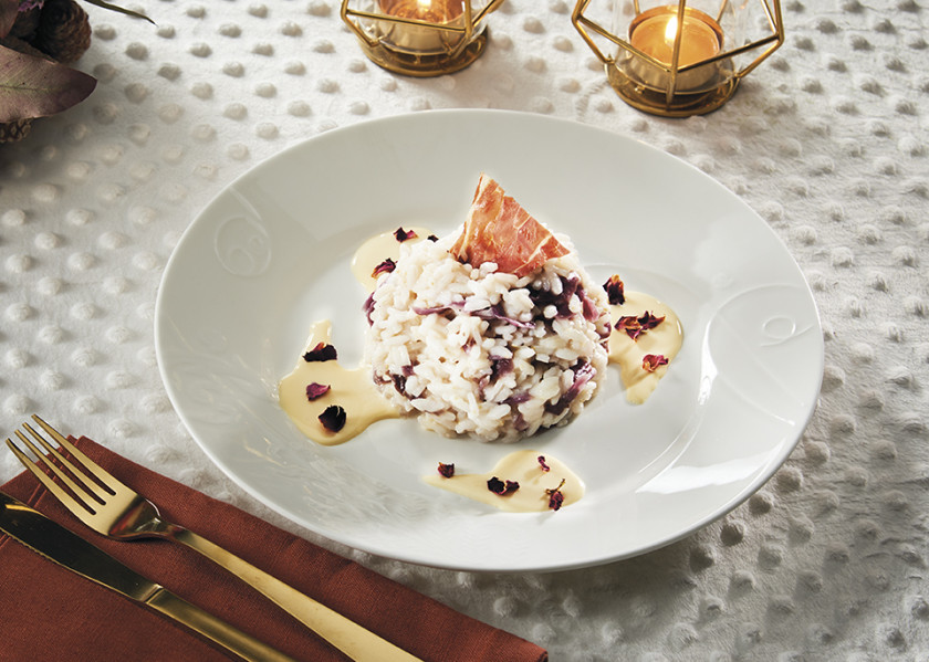 Rosolare la cipolla con il burro, aggiungere il Riso Carnaroli, tostare e aggiungere il vino bianco lasciando evaporare. Iniziare la cottura aggiungendo il brodo bollente preparato in precedenza. Nel frattempo tostare il prosciutto in forno. Due-tre minuti prima della fine cottura aggiungere il Cavolo viola. Terminare la cottura. Spegnere il fuoco e mantecare con burro e Parmigiano Reggiano grattugiato. Servire il risotto all’onda, decorato con i Petali di rosa, la Grancrema di pecorino DOP e il prosciutto crudo tostato.