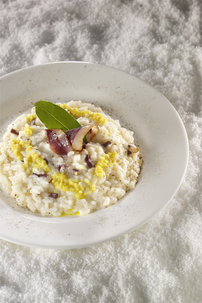 julienne il petto d’oca, avendo cura di tenerne da parte sei fette. Mantecare il risotto con lo stracchino e il parmigiano grattugiato,