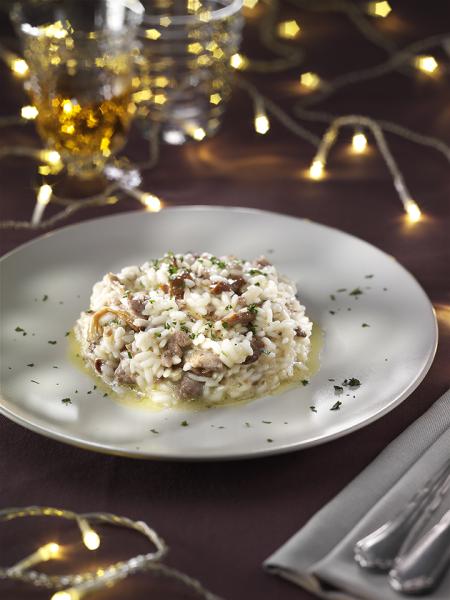 Preparare il brodo utilizzando il Gran Cuoco granulare secondo le dosi e le modalità riportate sulla confezione. Nel frattempo in un tegame scaldare un poco d’olio extra vergine e farvi imbiondire lo scalogno tritato; inserire la salsiccia sgranata e rosolarla, poi sfumare con vino bianco. Contemporaneamente scolare i funghi dal loro liquido di governo e saltarli in padella con olio extra vergine, prezzemolo e aglio tritati; unirli di seguito alla salsiccia. In una casseruola soffriggere la cipolla tritata fine in olio extra vergine; aggiungere il riso e tostarlo per qualche minuto, quindi bagnare con vino bianco e lasciar evaporare. Continuare a cuocere versando poco alla volta il brodo preparato. A cinque minuti dal termine incorporare la salsiccia e i funghi amalgamandoli con cura al risotto. A cottura ultimata togliere dal fuoco e mantecare con burro e parmigiano grattugiato.
