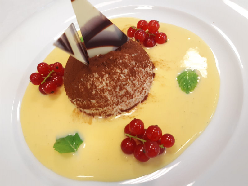 Con l’aiuto della planetaria o del montapanna montare per 5 minuti il preparato in polvere Dolcefreddo insieme al latte freddo; aggiungere la Delizia al caffè e amalgamare con cura gli ingredienti fino ad ottenere una crema omogenea. Distribuire il composto negli stampini e trasferirli nel congelatore per almeno 4 ore. Preparare la crema inglese seguendo le indicazioni riportate sulla confezione. Stendere la crema inglese sul piatto. Sformare i semifreddi, spolverarli con il cacao e posizionarli al centro del piatto. Ultimare decorando con ribes e decorazioni di cioccolato