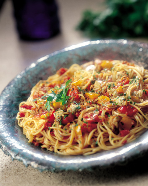 Rosolare in olio d’oliva uno spicchio d’aglio, eliminarlo e aggiungere le vongole e un po di brodo di pesce ottenuto con il saporitore alle vongole, due cucchiai di pomodoro per addensare mentre gli spaghetti cuociono (al dente). Aggiungere una manciata di prezzemolo (se si gradisce anche aglio tritato), salare e pepare. Saltare gli spaghetti nel sugo aggiungendo i peperoni tagliati a cubetti, le vongole e servire caldi con un filo d’olio crudo.