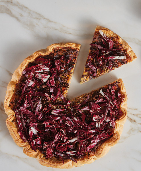 Verser une dose d'appareil à l'œuf dans une jatte. Ajouter la Sauce à la chicorée rouge, le parmesan et les Flocons de pommes de terre pour épaissir. Garnir le moule avec la pâte feuilletée, déposer les tranches de jambon cuit et la Provola, et verser l'appareil précédemment obtenu. Parsemer la surface de chicorée fraîche coupée en julienne et de parmesan râpé. Cuire au four ventilé à 170/180°C pendant 40 minutes environ. Laisser refroidir la tarte avant de la démouler.