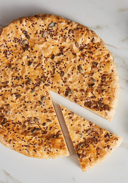 Versez une portion de garniture à base de ricotta dans un bol, puis ajoutez la crème de potiron, le sel, le parmesan râpé, la Grancrema de Gorgonzola, un œuf entier et le romarin finement haché. Mélangez bien les ingrédients et épaississez avec la chapelure. Tapissez un moule avec la pâte feuilletée. Garnissez avec le mélange obtenu, en l'étalant de manière homogène. Recouvrez la tarte avec un disque de pâte feuilletée et scellez les bords en les pressant avec une fourchette. Badigeonnez la surface avec du jaune d'œuf et parsemez de graines. Faites cuire au four à 170/180°C pendant 30 à 35 minutes