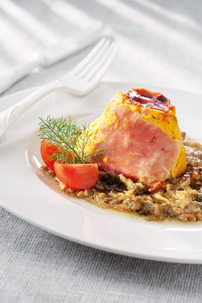Imburrare sei stampini e foderarli con le fette di prosciutto cotto. Nel frattempo in una ciotola sbattere le uova con l'aiuto di una frusta; aggiungere la panna, la salsa arlecchino, il parmigiano grattugiato e il prezzemolo tritato. Insaporire con una macinata di pepe e amalgamare bene il composto, quindi suddividerlo negli stampini. Cuocere in forno a 180° per circa 30 minuti. In una padella scaldare il condimento al finocchietto e distribuirlo nei piatti; sformarvi sopra i timballi ai peperoni e servire subito.