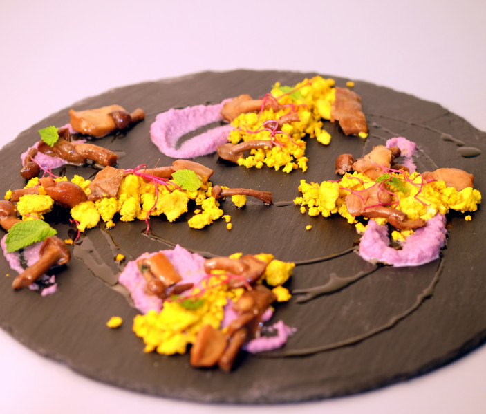 Tofu alla curcuma, crema di cavolo viola e funghi