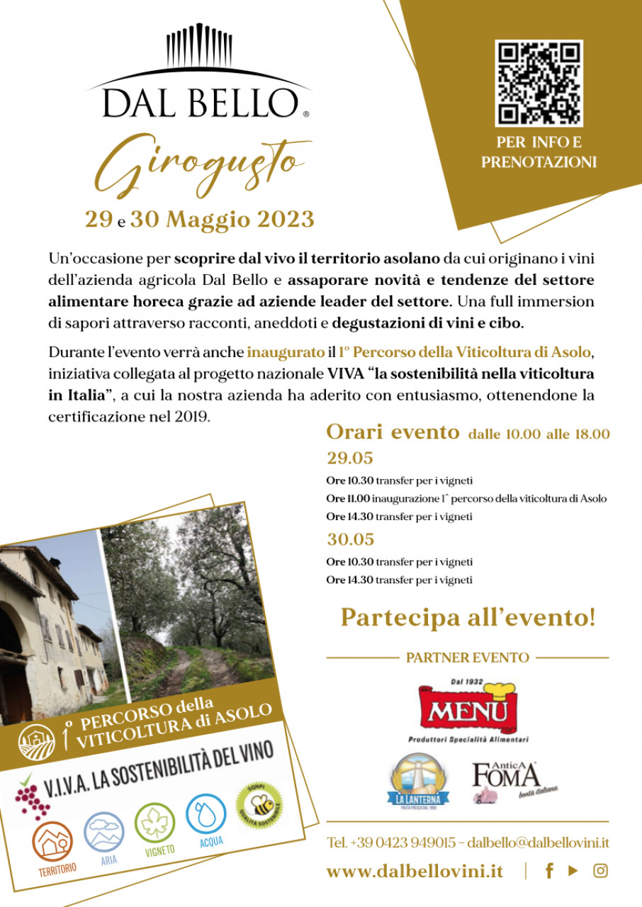 Durante l’evento verrà anche inaugurato il 1° Percorso della Viticoltura di Asolo, iniziativa collegata al progetto nazionale V.I.V.A. “la sostenibilità nella viticoltura in Italia”, a cui Dal Bello ha aderito con entusiasmo, ottenendone la certificazione nel 2019.