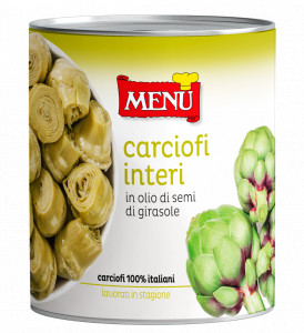 Carciofi interi di medio calibro, privati del gambo, cucinati in olio ed insaporiti con erbe aromatiche ed aceto. Particolarmente indicati per antipasti e contorni.