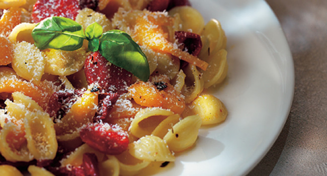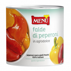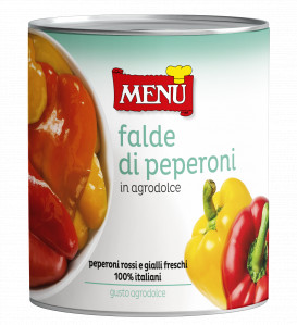 Grossi e freschissimi peperoni rossi e gialli tagliati in quattro parti e conservati in un liquido leggermente agrodolce. Ottimi per antipasti, contorni e panini.