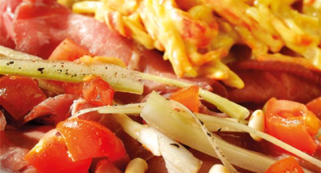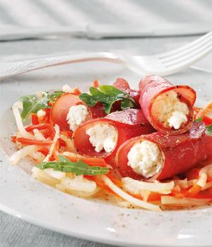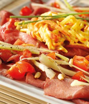Carote e sedano rapa tagliati alla julienne e filetti di peperoni rossi, conservati in un liquido leggermente agrodolce. Ottima per preparare insalate russe, come contorno a piatti di carne e per farcire panini e tramezzini.
